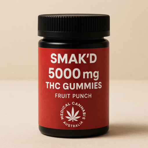 SMAK’D 5000mg THC Gummies (Fruit Punch) are ultra-high potency medical cannabis edibles designed for experienced patients requiring significant therapeutic relief. Infused with 5000mg of THC per pack, each fruit punch gummy delivers a consistent, lab-tested dose ideal for managing chronic pain, severe insomnia, or advanced conditions. These high-strength THC edibles are made with premium cannabis extract and offer fast-acting, long-lasting relief. Only available via prescription in Australia, SMAK’D Gummies are tailored for medical users seeking discreet, powerful cannabis treatment in edible form. Enjoy bold fruit punch flavour while maintaining pharmaceutical-grade dosing